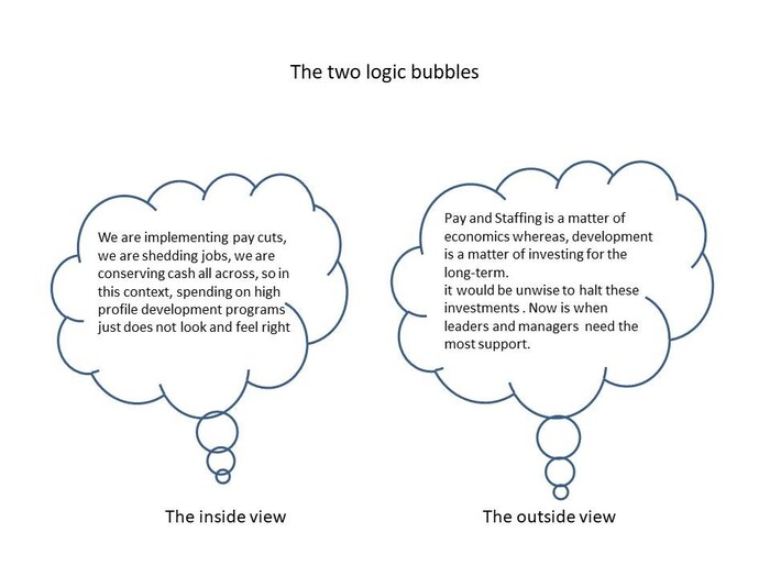 Those viewing the situation from outside seem to take the view that Pay and Staffing is a matter of economics whereas, development is a matter of investing for the long-term. Their view is that it would be unwise to halt real developmental investments because this is the time when leaders and managers and employees need the most support to succeed.